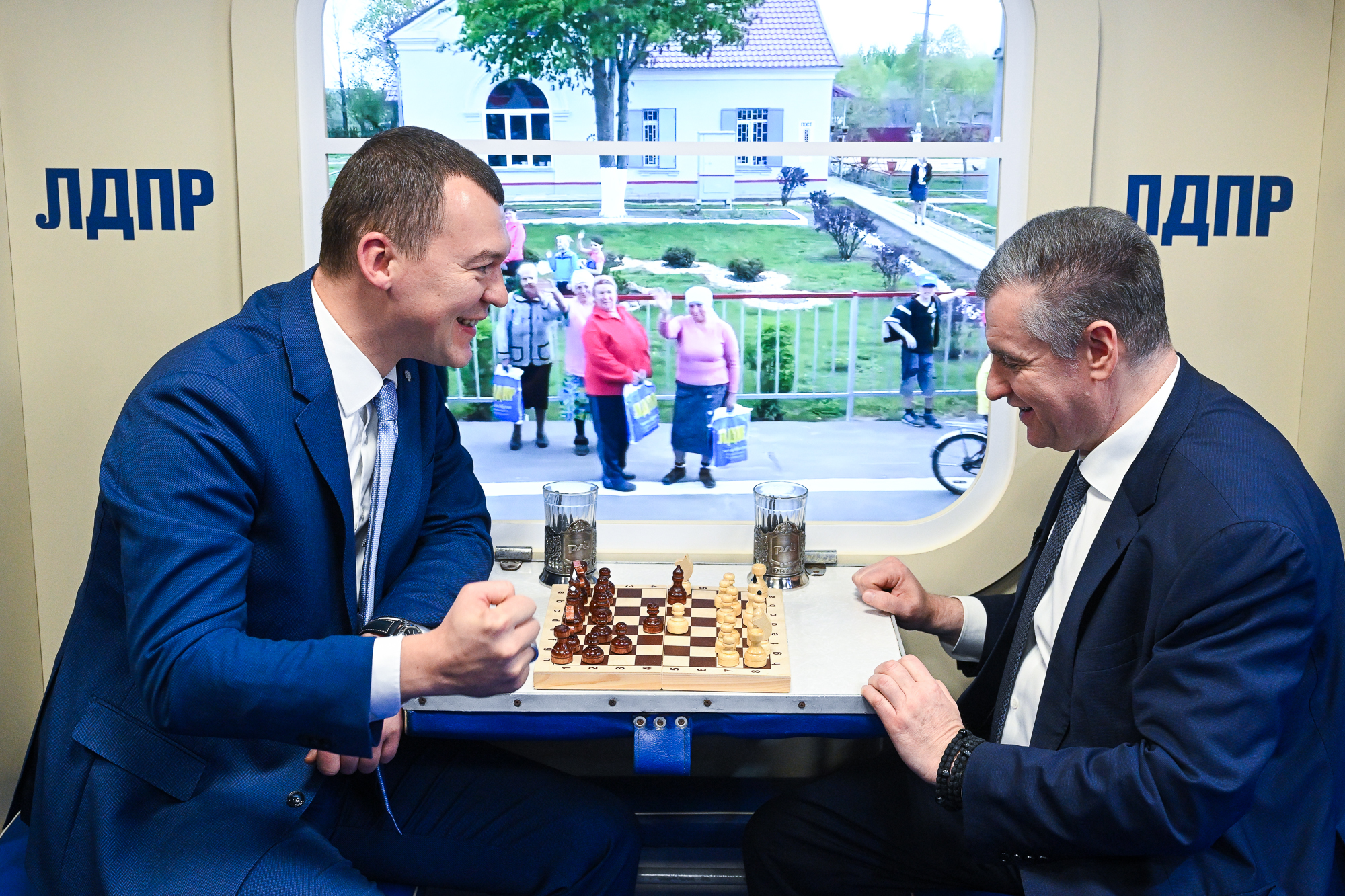 Дегтярев комментировал экспозицию, экспонаты, сфотографировался с плакатами ЛДПР прошлых лет и сыграл в шахматы с Леонидом Слуцким в репродукции купе железнодорожного вагона, представленной на выставке. В таком же купе Владимир Жириновский на партийном поезде проехал 120 тысяч километров, исколесив почти всю Россию.